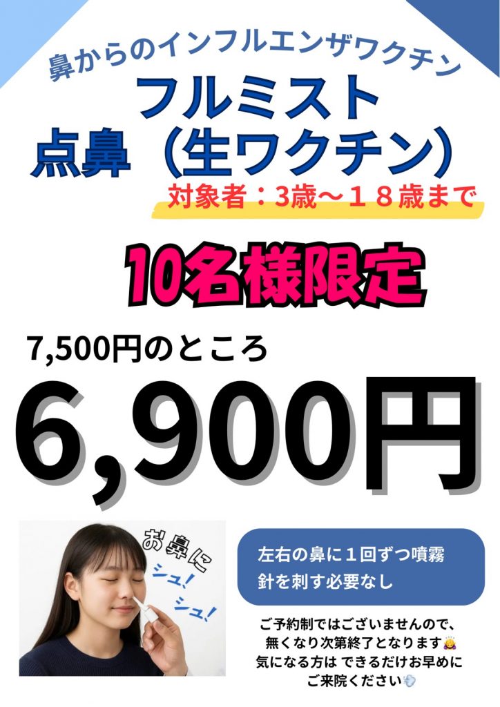 今年から3~18歳の方限定で点鼻でできるインフルエンザ予防接種の「フルミスト」取り扱い開始いたしました。
